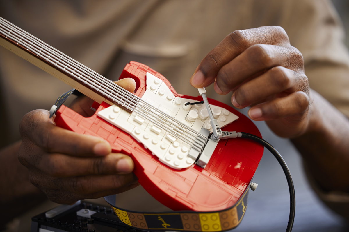 Like most finalised sets that originate from LEGO Ideas, the company fine tuned the design of Letenay’s concept – making the guitar appear as close as possible to its actual counterpart. As seen from the photos provided by the company, the LEGO replica of the Fender Stratocaster features its iconic design in either black or red colour options. This is accompanied together with a white scratch plate, triple single-coil pickups, poseable tuning pegs, a tremolo arm, and six guitar strings. And yes, you can attach an included guitar strap to its front button and rear knob.