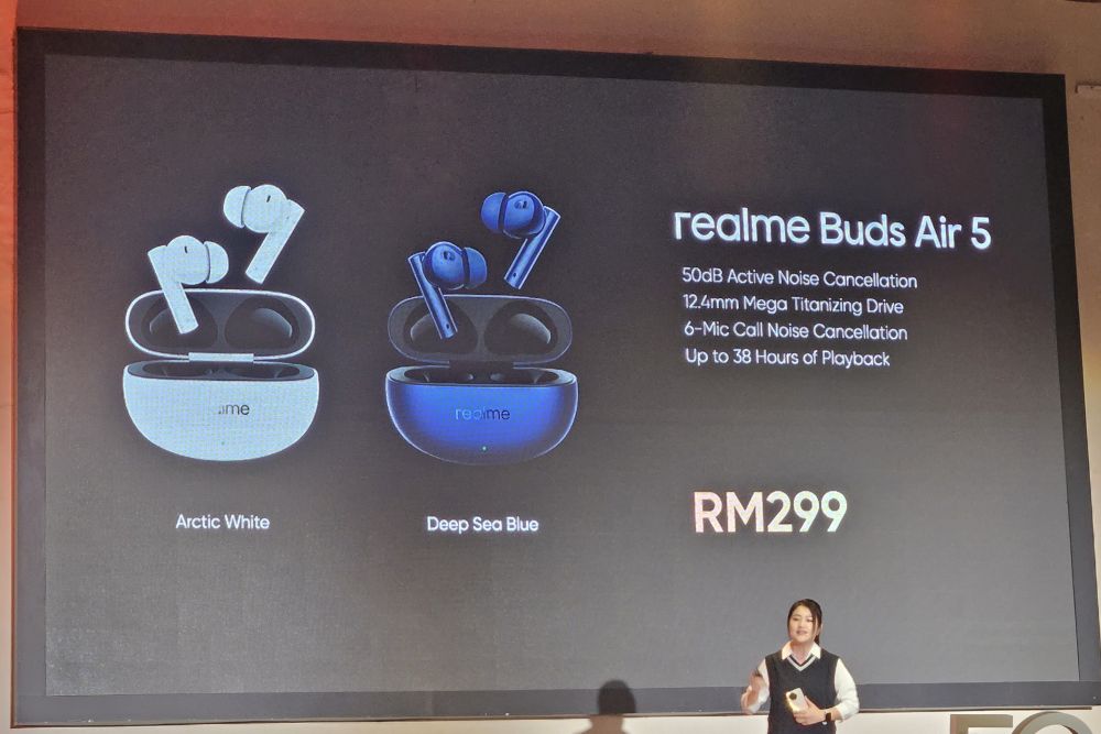 And finally, the realme Buds Air 5. These TWS buds sport 12.4mm drivers, three levels of noise cancelling, and a battery life boasting 38 hours of playback time. Connectivity to smart devices is done via Bluetooth 5.3, and it comes with an IPX5 rating to top it all off.